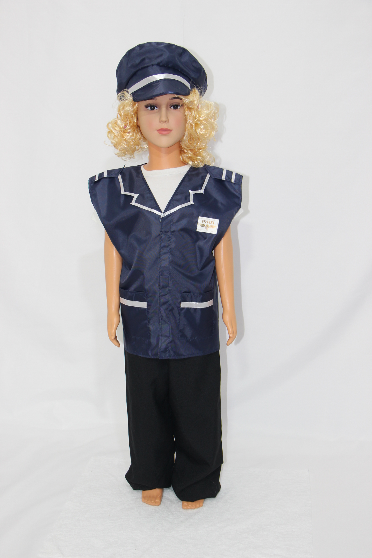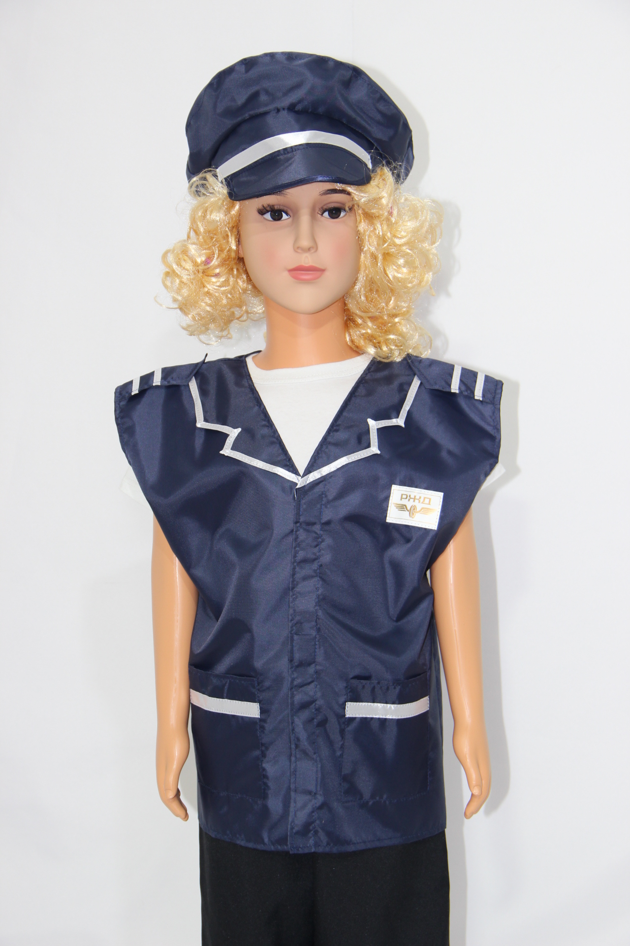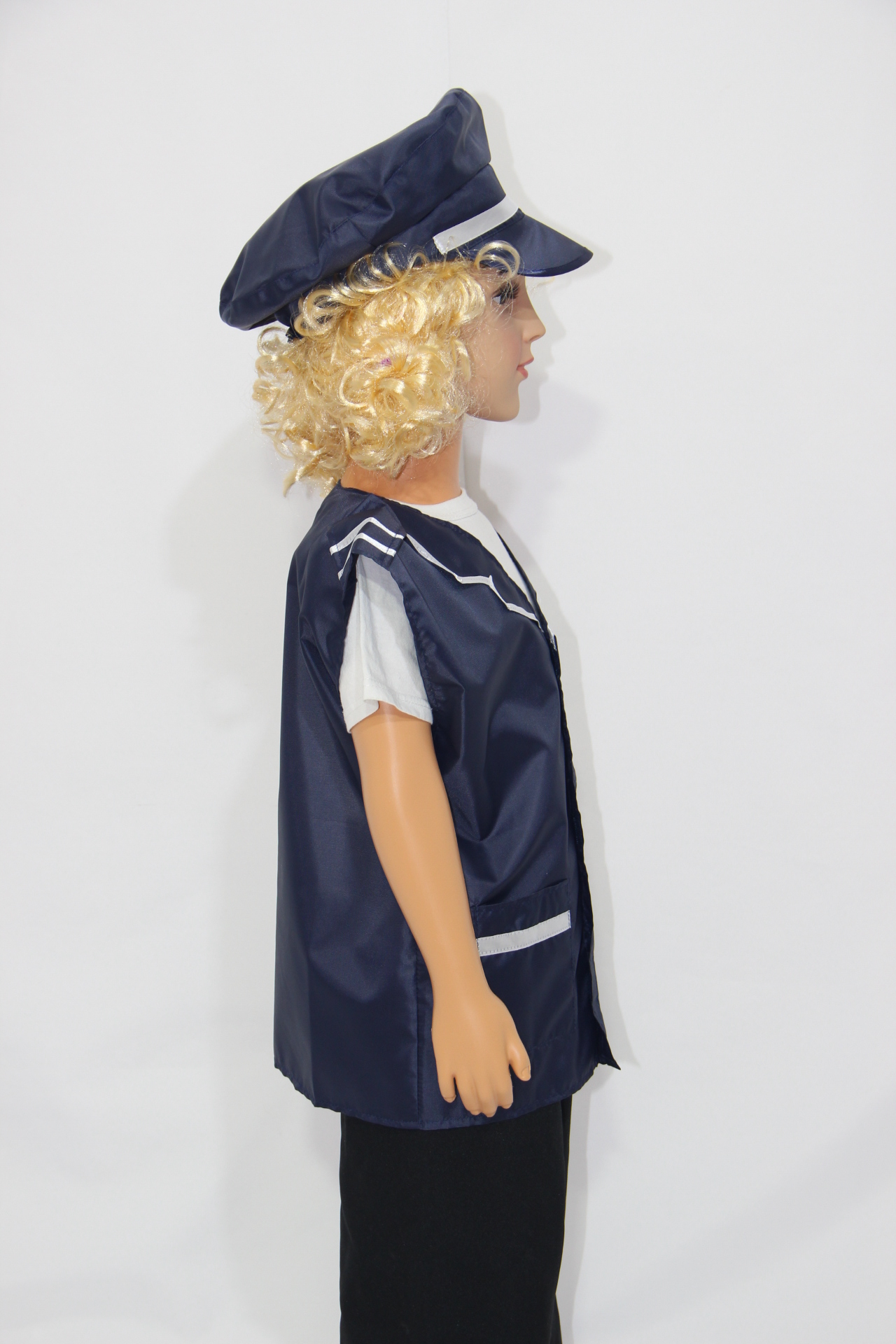 Комплект включает в себя жилет и фуражку, которые выглядят, как настоящие. Полиэстер в составе материала делает одежду износостойкой, позволяет ей выдерживать даже самую активную эксплуатацию.