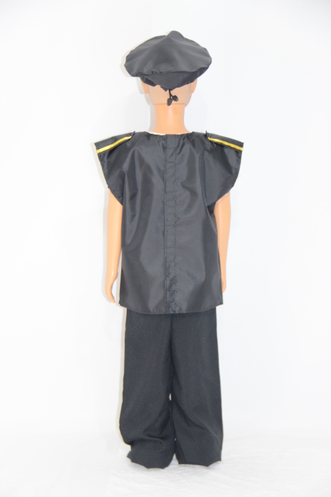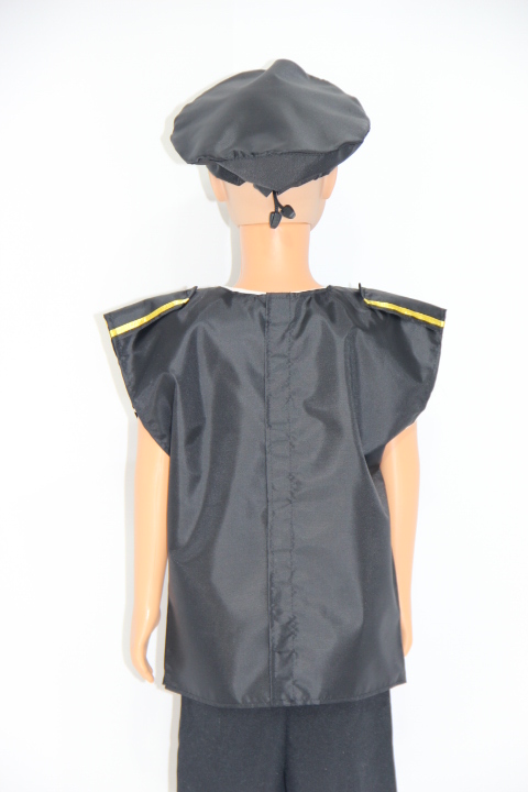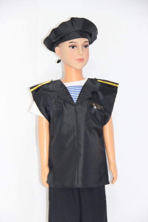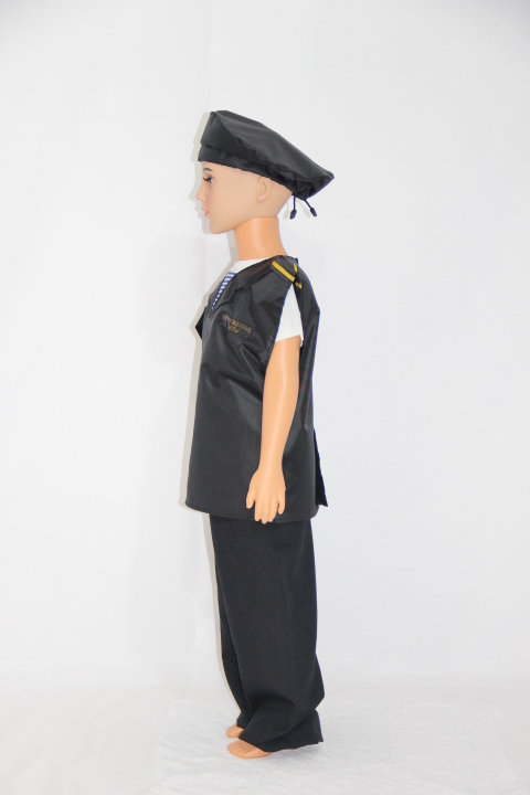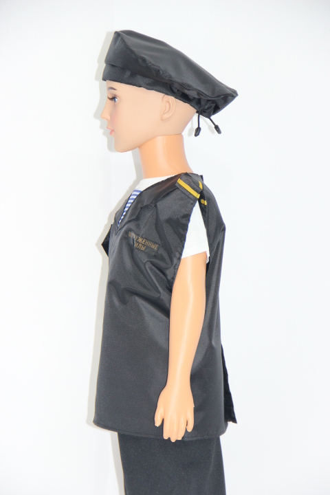 Комплект включает в себя жилет и берет. Черный цвет делает материал не марким, он не требует частых стирок даже при очень частых играх на открытом воздухе. При этом полиэстер, из которого сделана одежда, способен выдержать многие стирки и активную эксплуатацию: он прочен, износостоек, хорошо сохраняет форму и цвет.