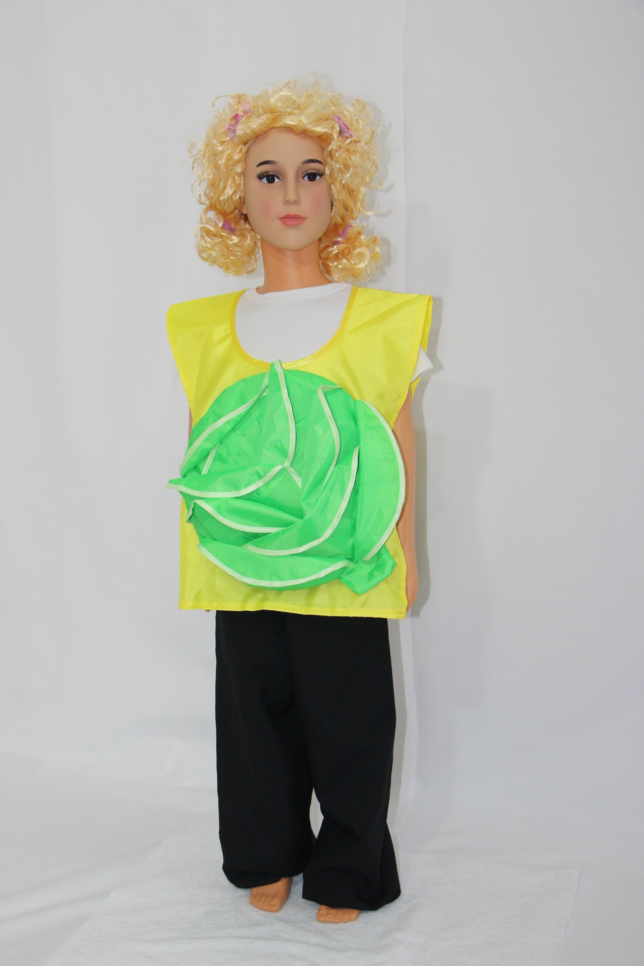 Красочный и нарядный жилет Капуста предоставляет ребенку свободу движения. Под него можно надеть любую одежду, в которой малышу будет удобно играть свою роль в постановке. Полиэстер, из которого сделан жилет, неприхотлив в уходе, износостоек, выдерживает множество стирок, не теряя при этом форму и цвет. Материал долго будет сохранять свою красоту даже при активной эксплуатации.