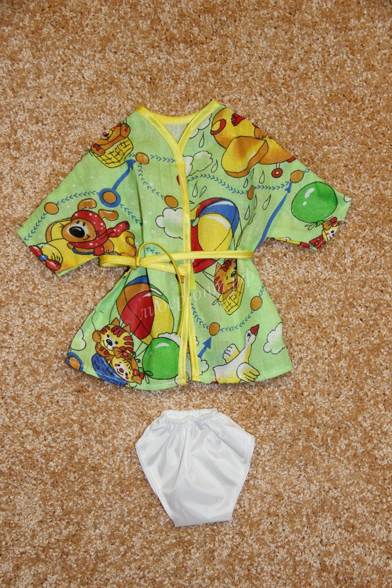 Яркий халат с рисунком выглядит очень нарядно, он похож на настоящий. В комплекте с ним идут трусики для куклы. Одежда выполнена из хлопка и полиэстера: она прочна и долговечна, приятна на ощупь, хорошо переносит стирки, сохраняя форму и цвет.
