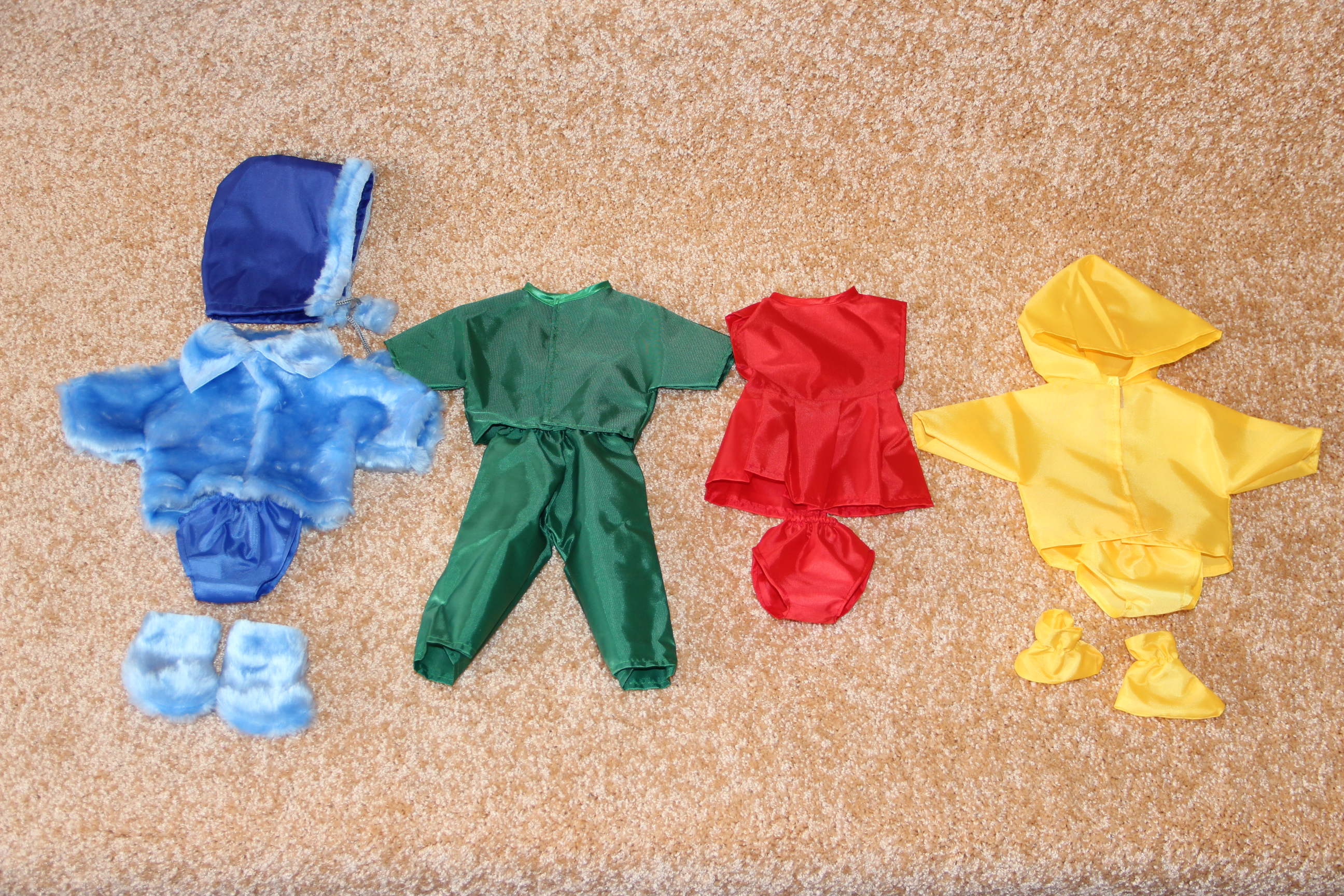 Комплект кукольной одежды включает в себя наборы для четырех времен года: осенняя куртка с капюшоном и сапожки, весенний костюм (куртка и штаны), летнее платье и шуба с обувью. Одежда подходит для кукол ростом 40 - 45 см. Выполнена она из прочного и износостойкого полиэстера, который прослужит долгое время и выдержит частые стирки при невысоких температурах. Материал не мнется, хорошо отстирывается, долго сохраняет изначальный цвет и форму.