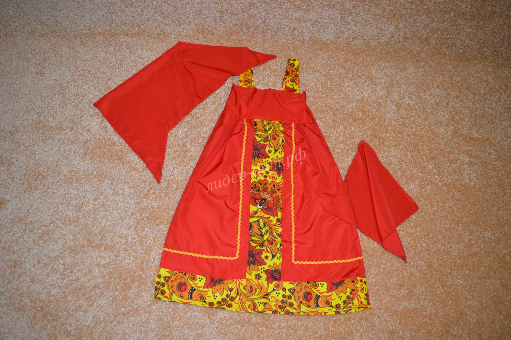 Нарядный комплект включает в себя расписной сарафан, платочек на голову и платочек в руку. Красный и желтый цвета делают одежду по-настоящему праздничной и броской. В таком сарафане удобно плясать, ведь его свободный крой не стесняет движения, а легкий вес позволяет ходить в нем хоть целый день, не ощущая никакого дискомфорта. Полистер делает костюм износостойким: он долгое время не потеряет своей яркости и будет выглядеть, как новый.