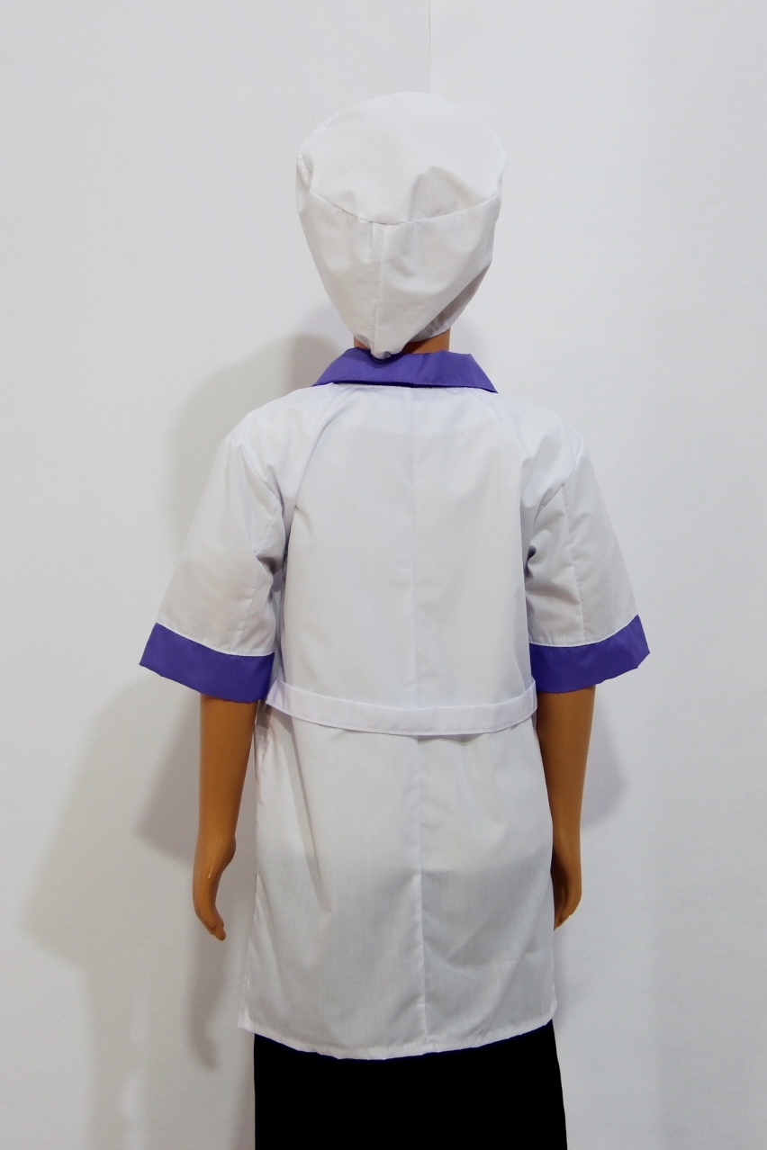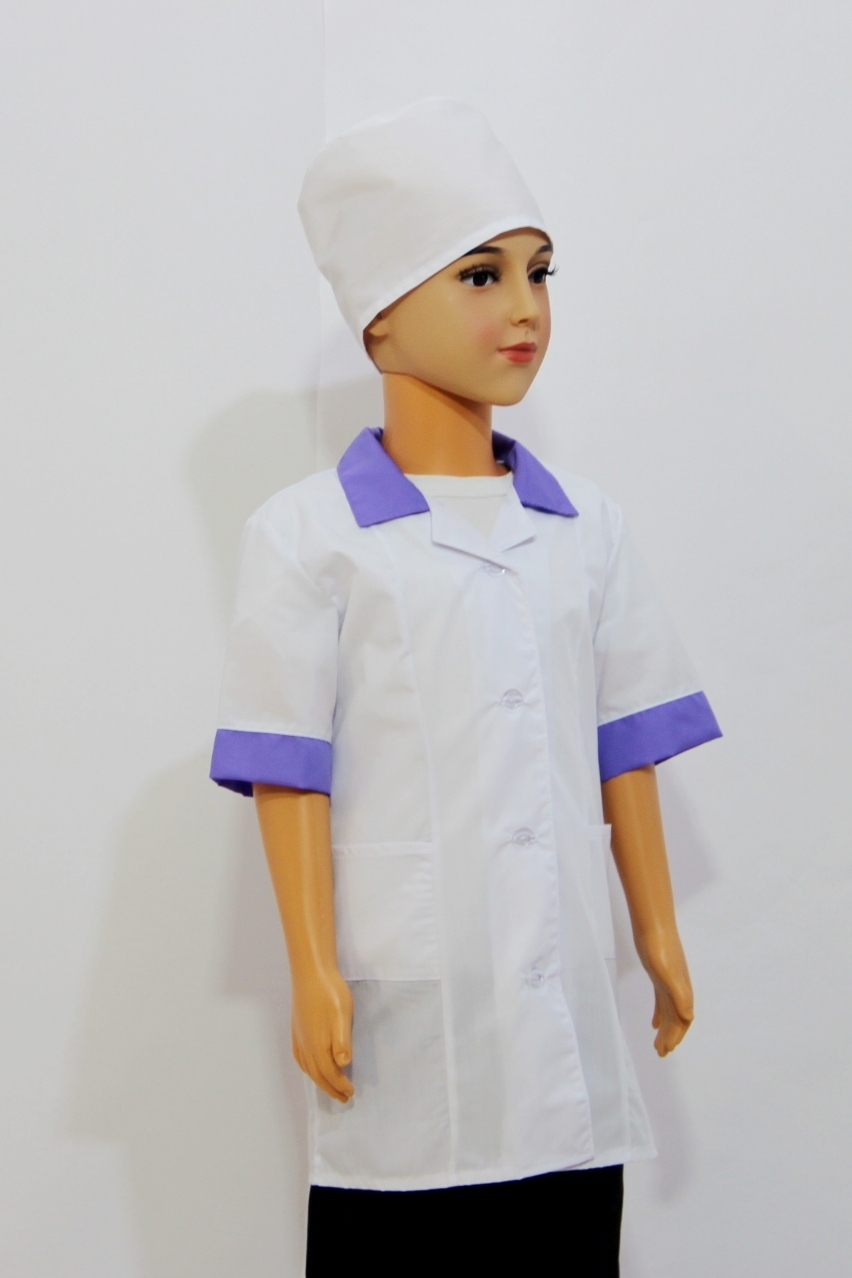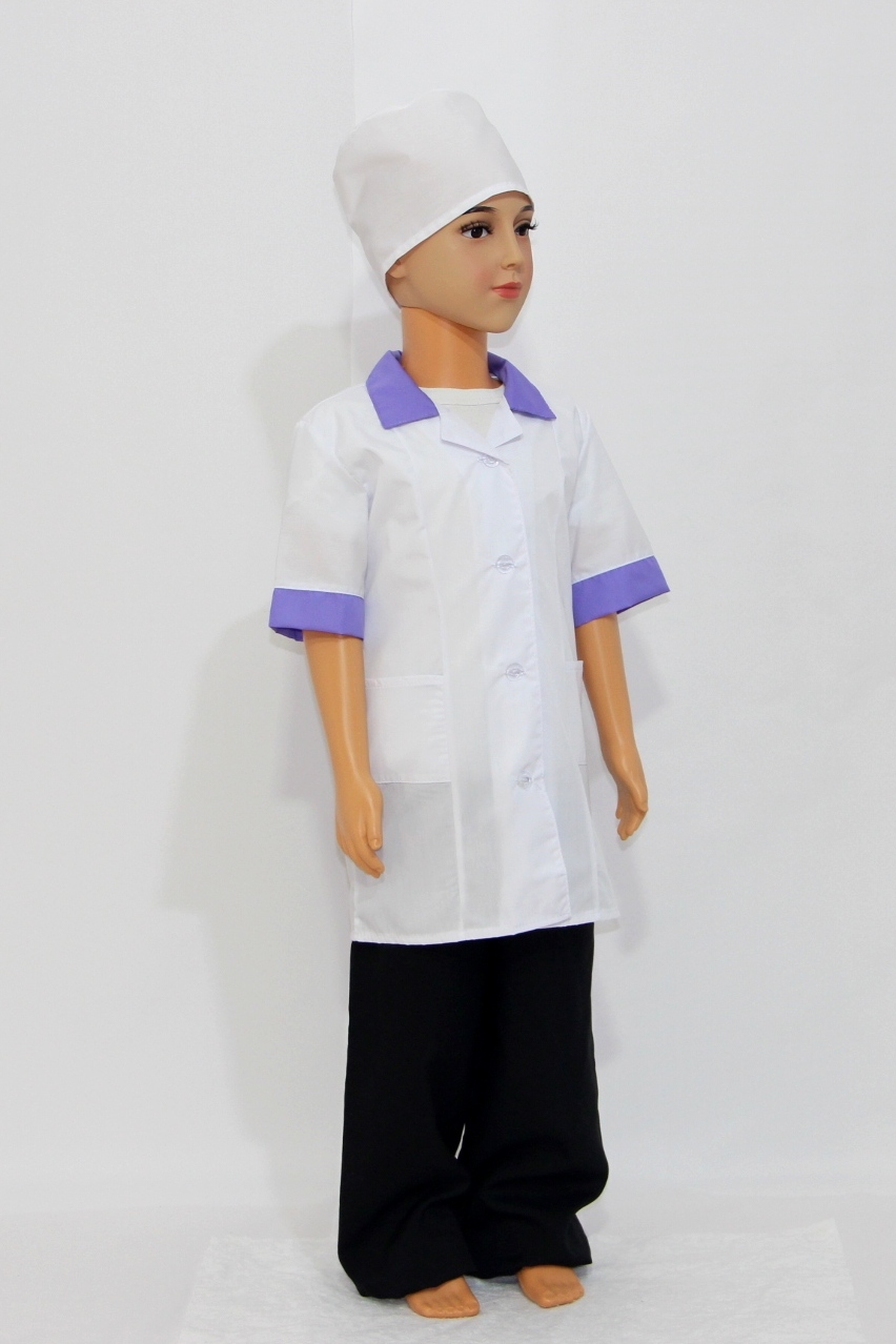 Комплект включает в себя халат и шапочку. Хлопок позволяет материалу дышать, пропуская воздух к телу. Поэтому ребенку будет комфортно носить этот костюм даже долгое время. А за счет полиэстера в составе ткани материал становится более износостойким и простым в уходе.