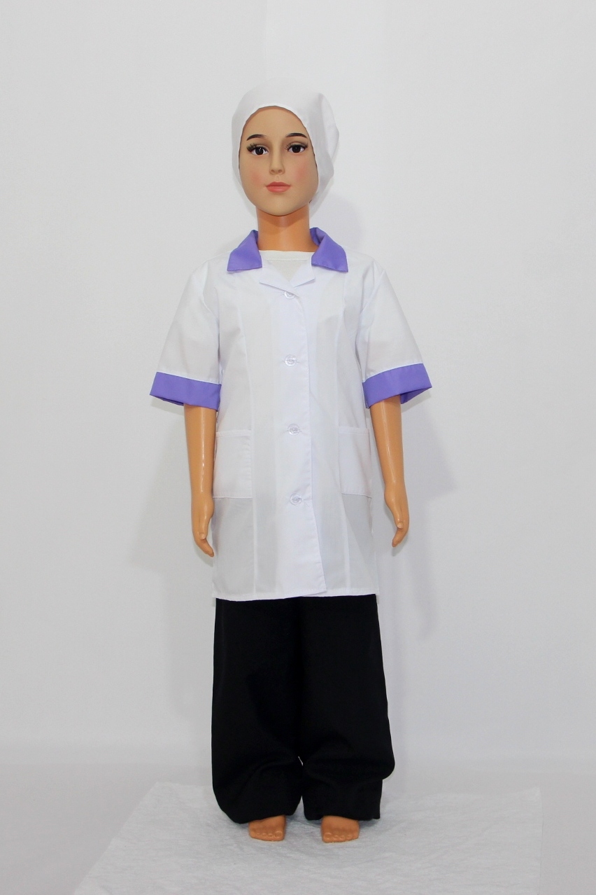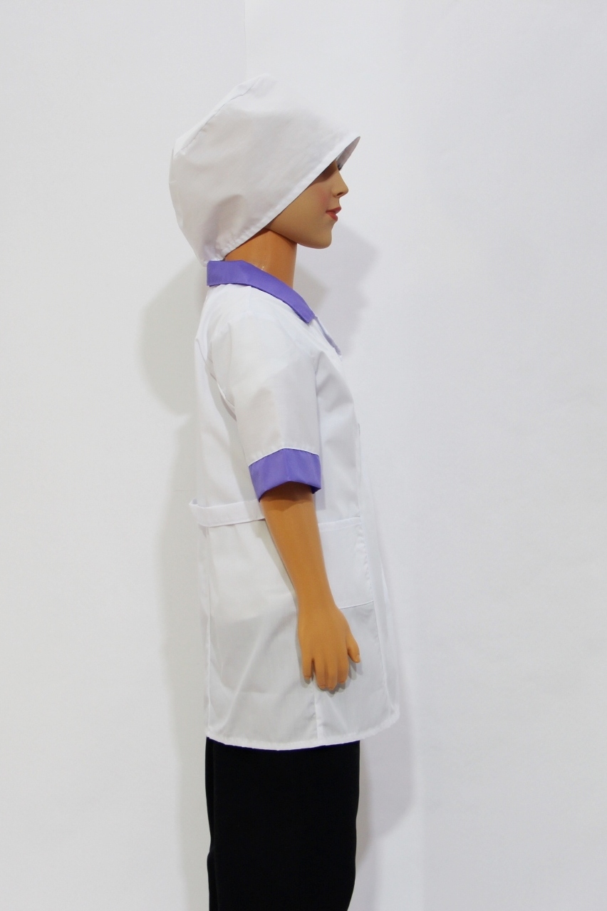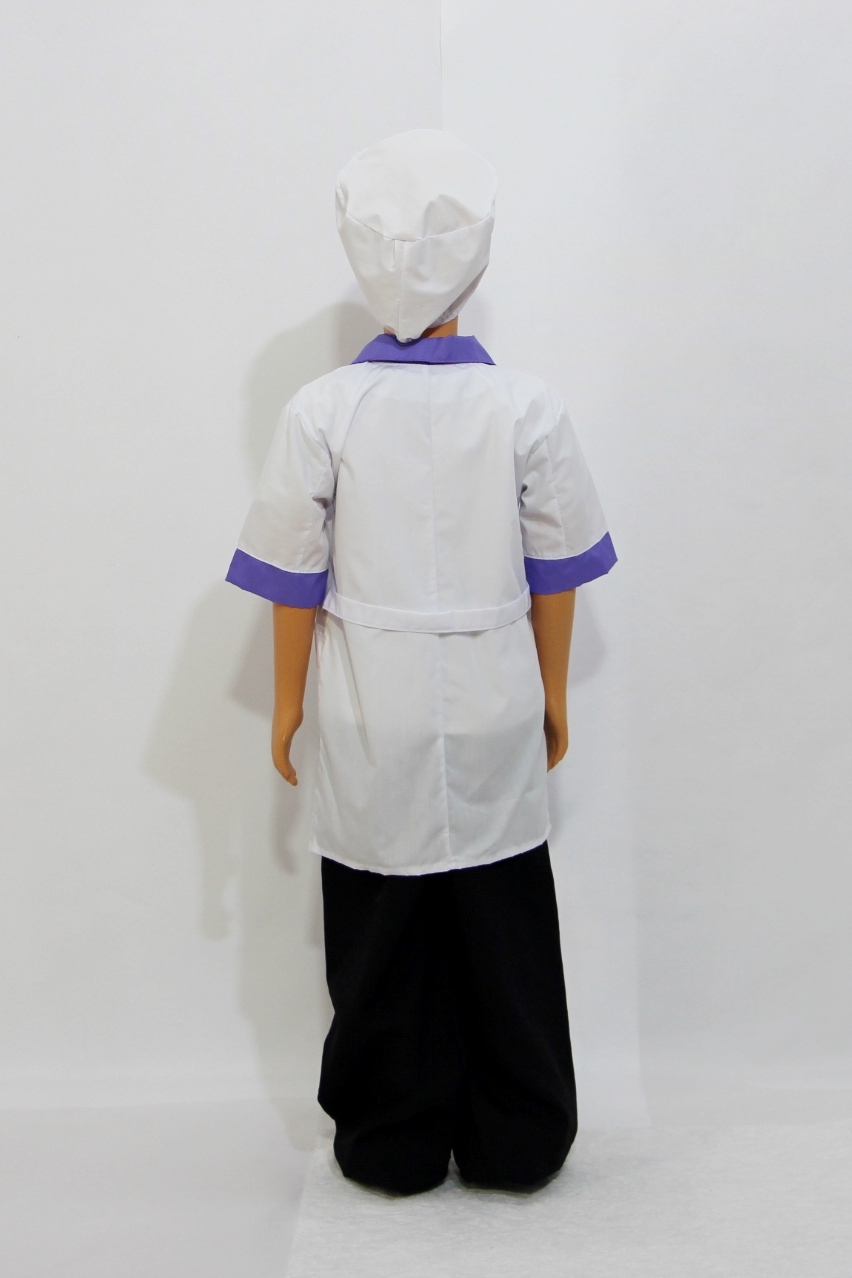 Комплект включает в себя халат и шапочку. Хлопок позволяет материалу дышать, пропуская воздух к телу. Поэтому ребенку будет комфортно носить этот костюм даже долгое время. А за счет полиэстера в составе ткани материал становится более износостойким и простым в уходе.
