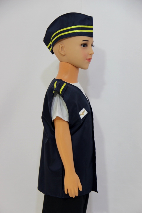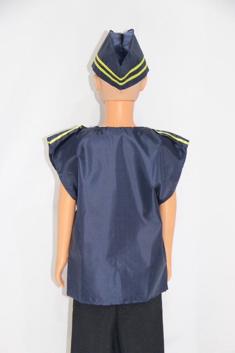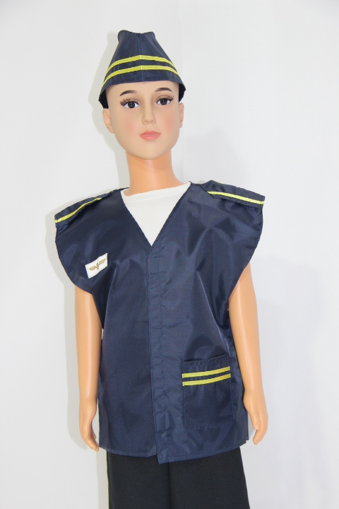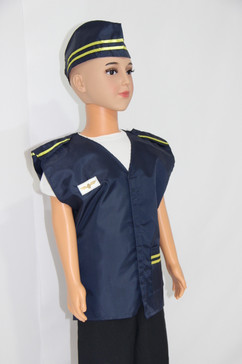 Комплект костюма проводника включает в себя жилет и пилотку. Сделанные из прочного и износостойкого полиэстера вещи прослужат долгое время, не теряя своей формы и цвета. А немаркий тем-синий цвет формы позволит реже стирать костюм. Свободный крой жилета не стесняет движений малыша, что делает любую игру комфортной и увлекательной. Надевать жилет можно поверх любой одежды, что очень удобно.