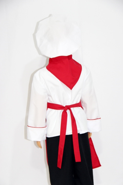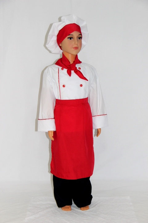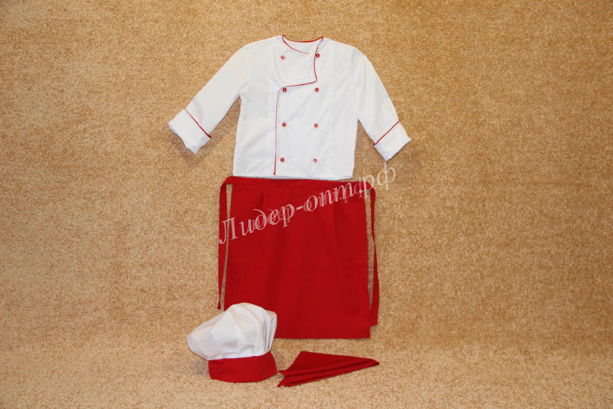 Комплект состоит из куртки, шейного платка, фартука и колпака. Куртка и фартук защитят одежду от случайных пятен. Головной убор особенно важен для работы на кухне, ведь он предотвращает случайное попадание волос в еду. Вместе с шейным платком колпак делает костюм шеф-повара особенно нарядным и максимально похожим на настоящий.