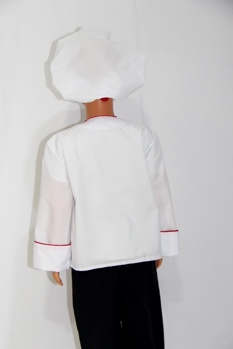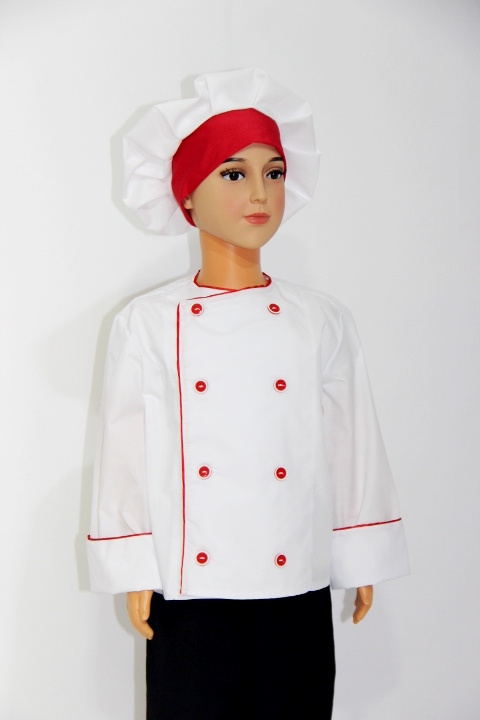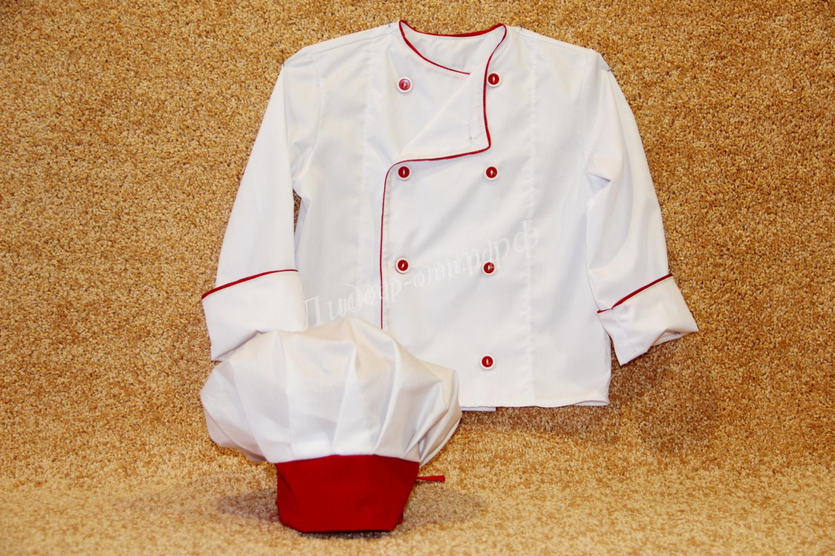 Комплект состоит из куртки и колпака. Куртка защитит одежду от случайных пятен. Головной убор особенно важен для работы на кухне, ведь он предотвращает случайное попадание волос в еду.