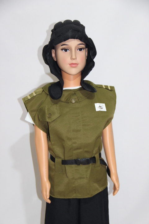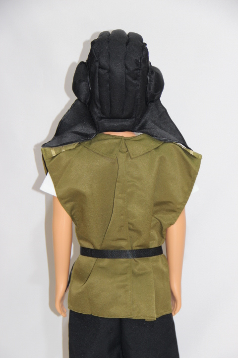Комплект включает в себя шлем, жилет и ремень. Темно-зеленый цвет делает наряд немарким. Хлопок в составе материала позволяет ему пропускать воздух к телу, поэтому ребенок будет чувствовать себя комфортно в этом наряде. Полиэстер делает ткань прочной, износостойкой, позволяет долгое время сохранять форму и изначальный цвет.