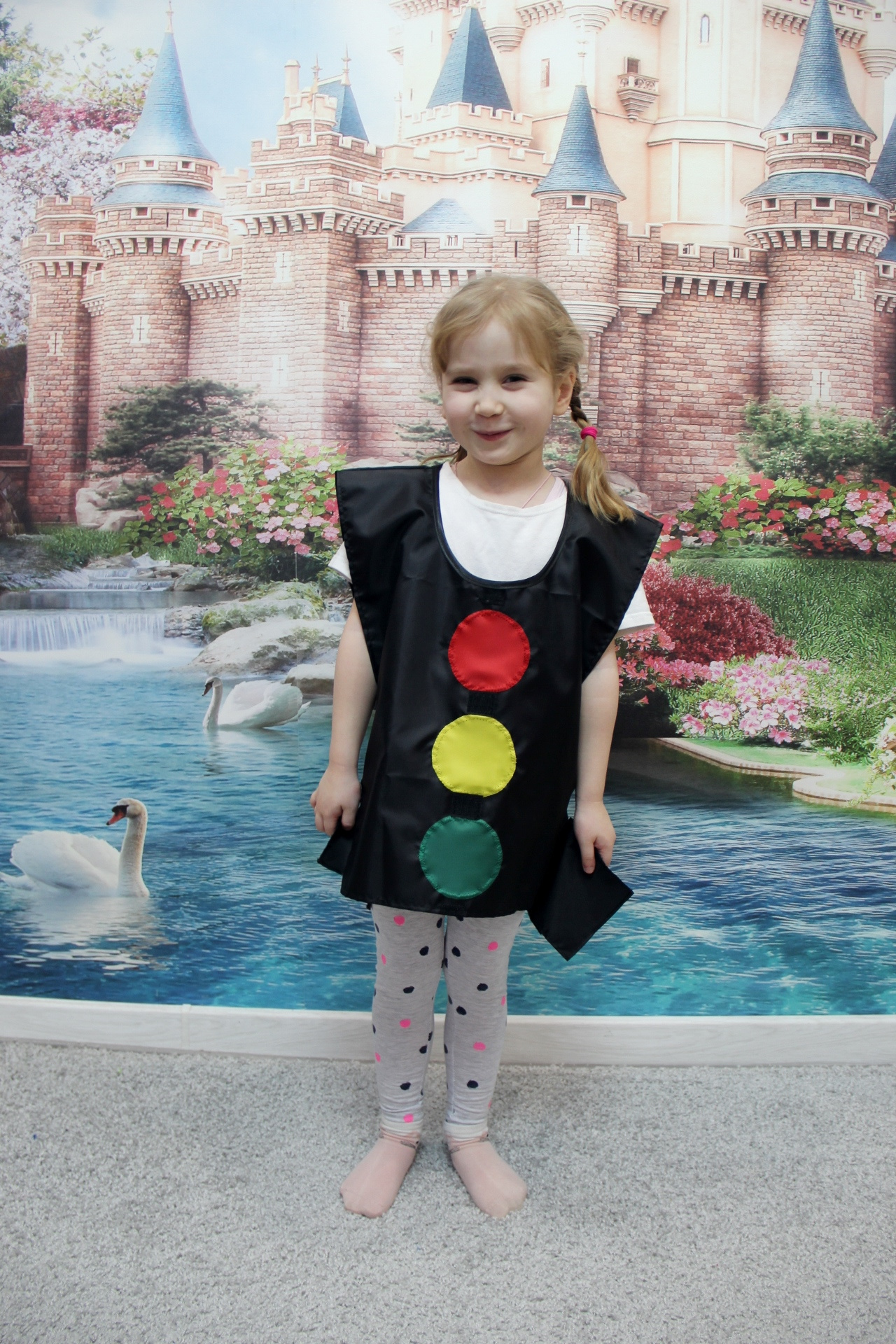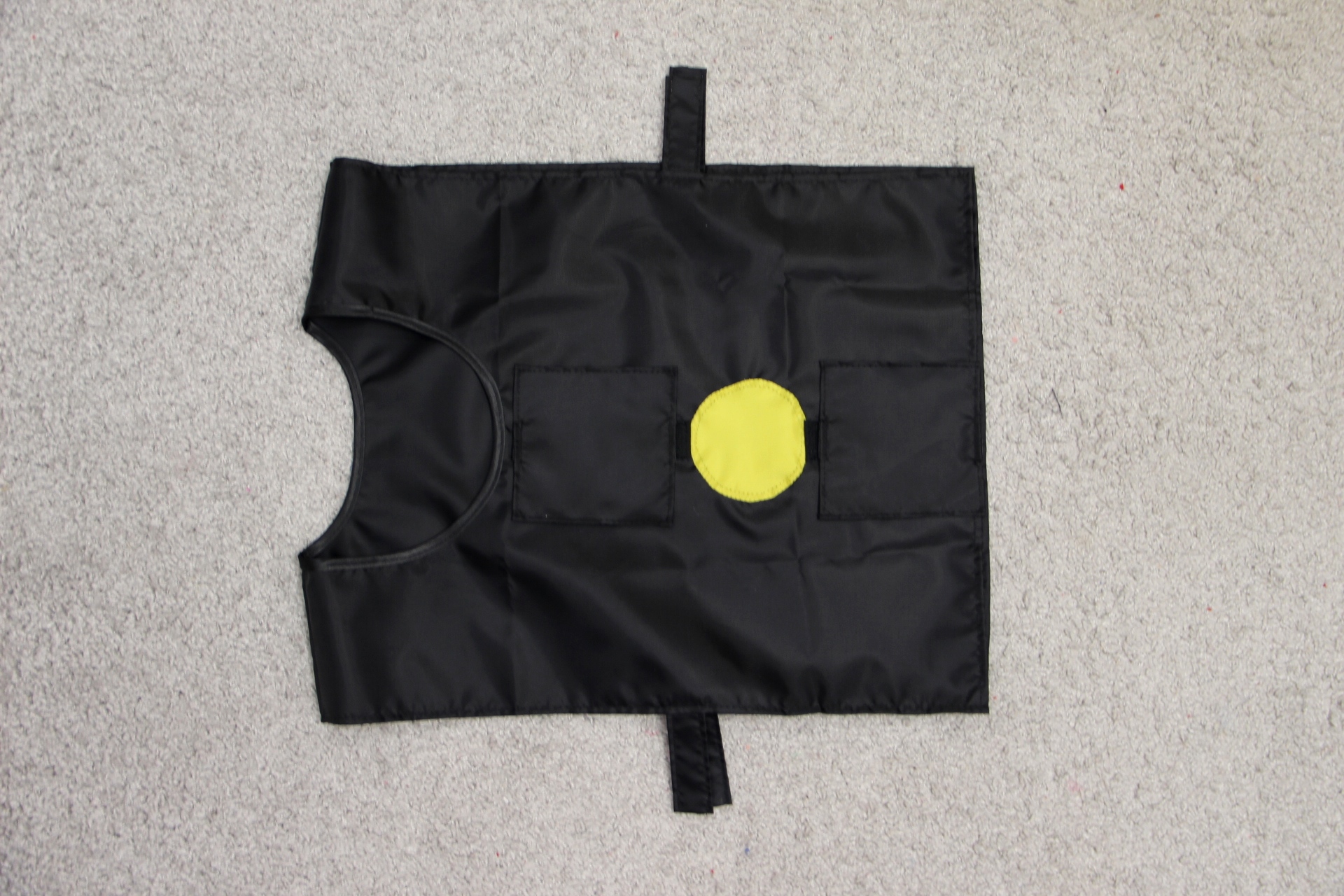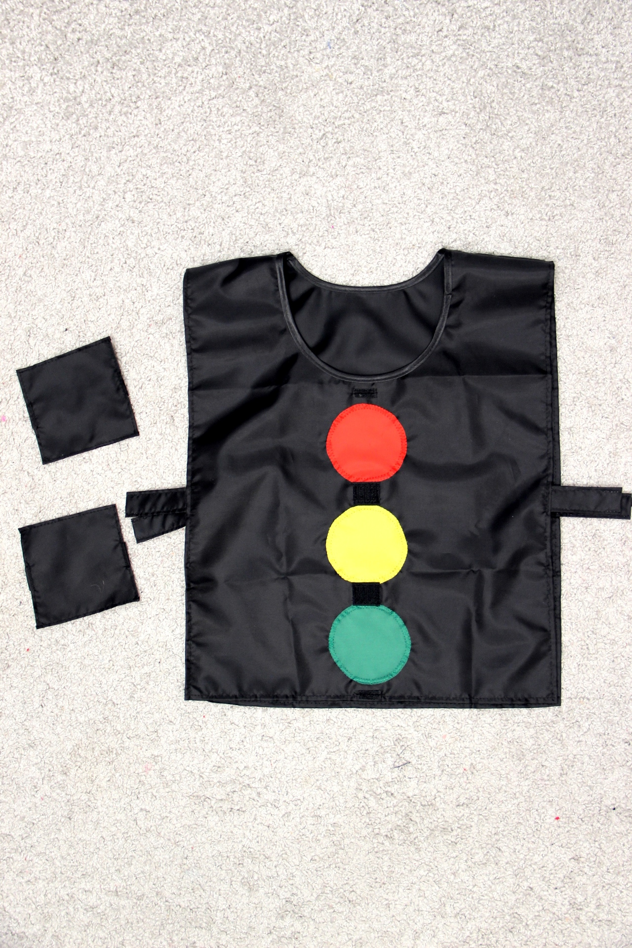 Черный жилет снабжен двумя заплатками на липучках такого же черного цвета. Залепляя на жилете те или иные цветные круги-лампочки, можно легко создавать иллюзию переключения света светофора.