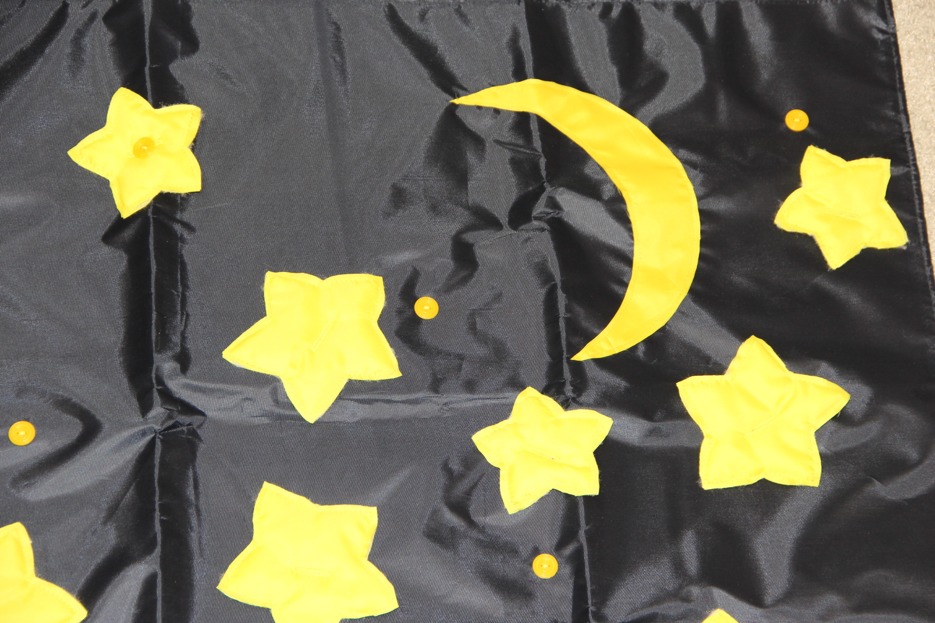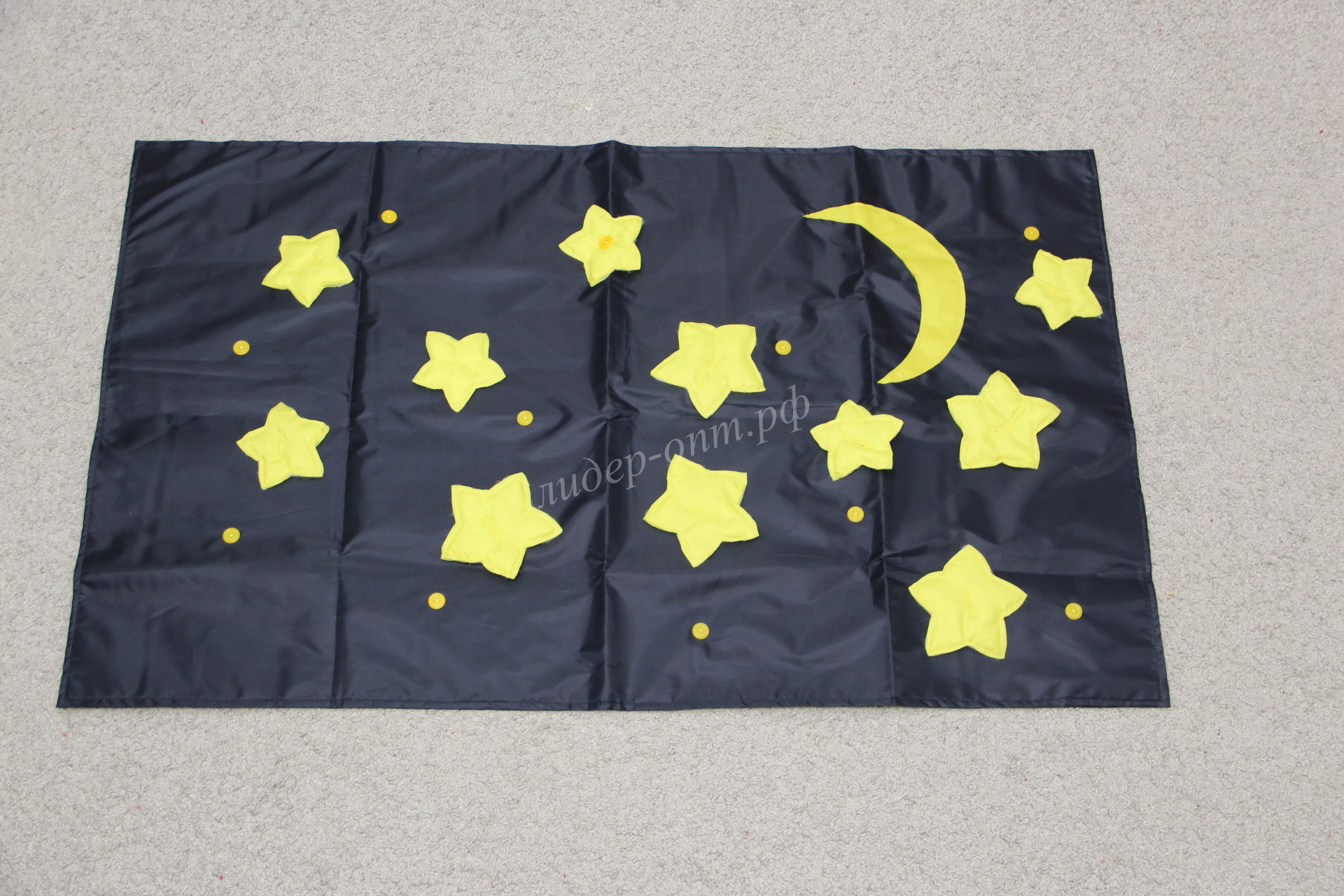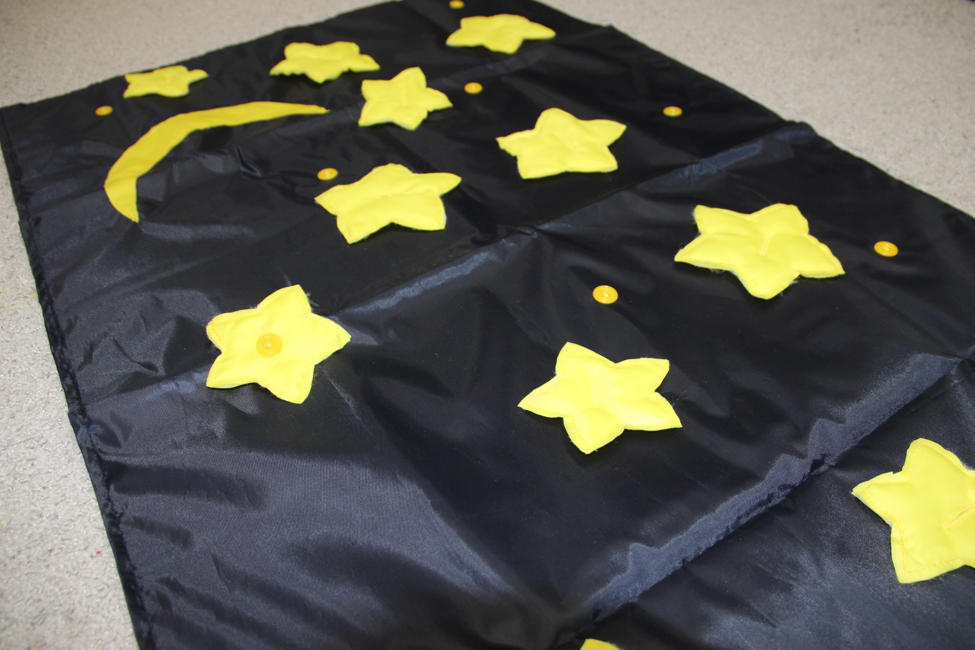 Мягкие тканевые звездочки крепятся на полотно «неба» пуговицами. Это делает игру абсолютно безопасной: все ее элементы крупные, их невозможно проглотить. А отсутствие жестких деталей предотвращает риск травмировать детские пальчики.