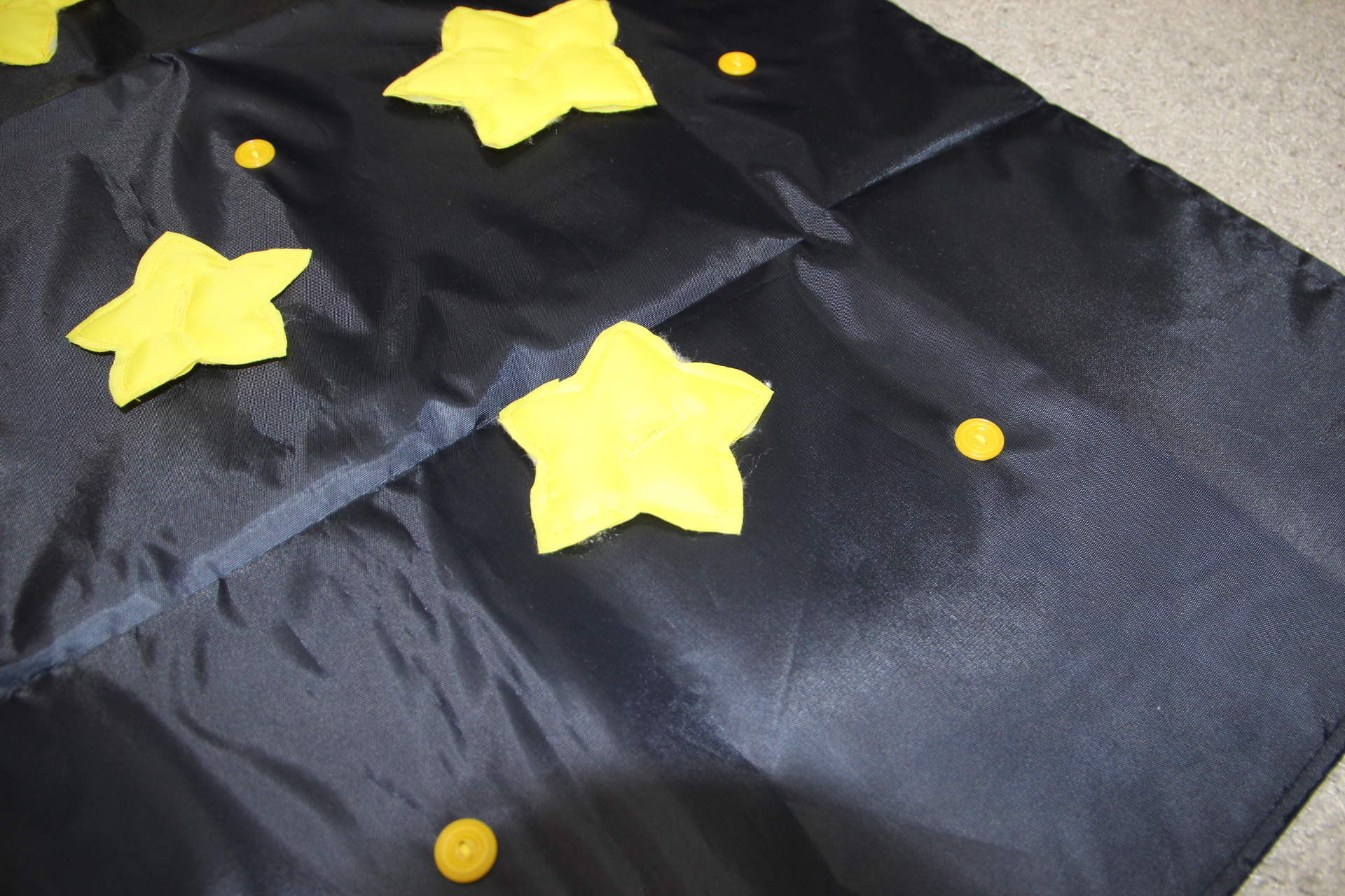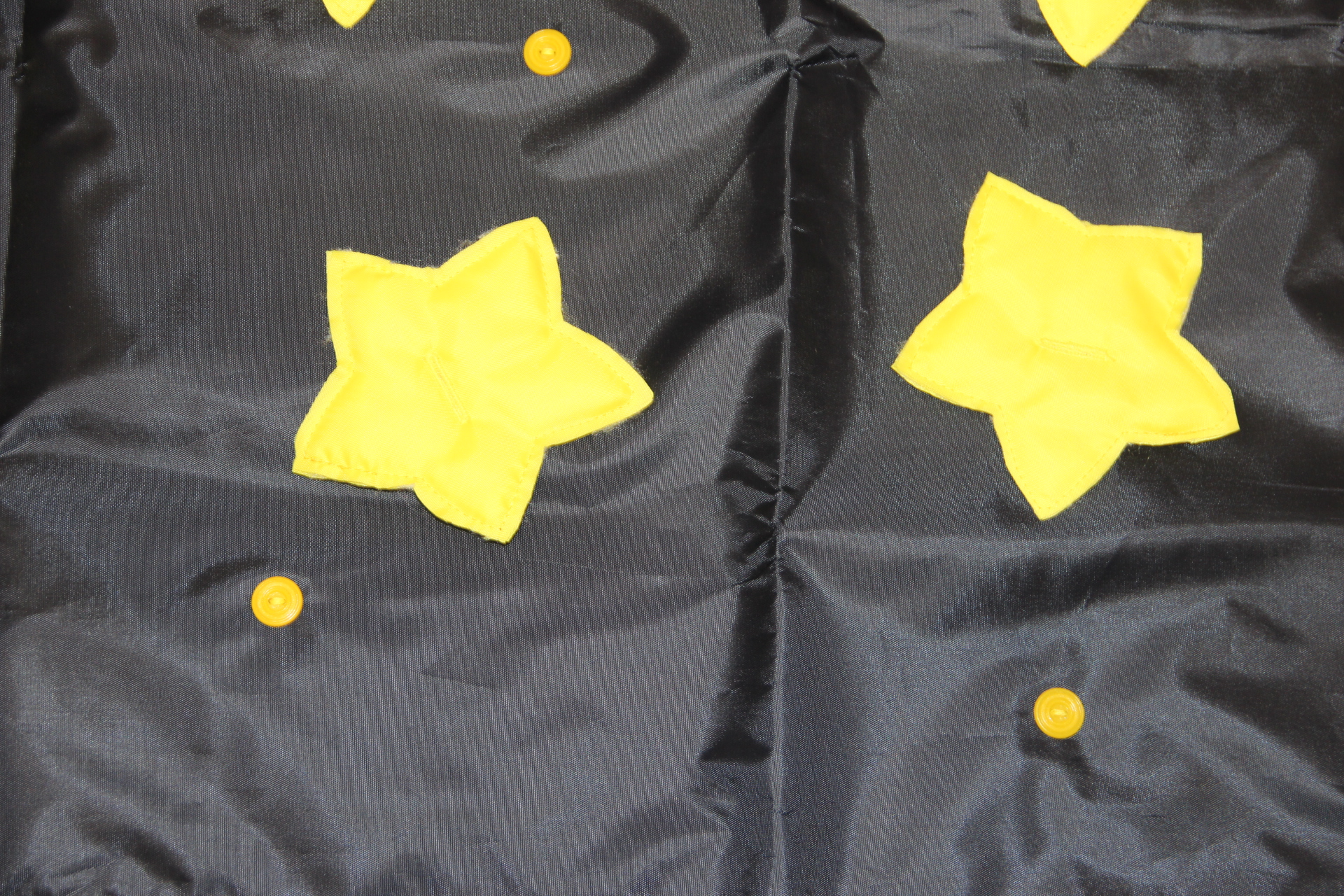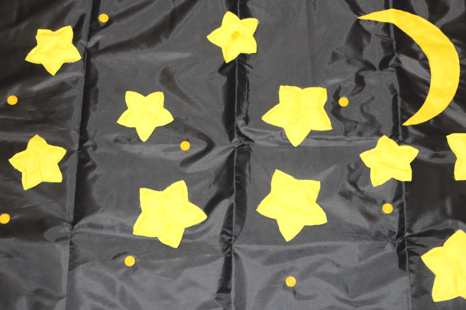 Мягкие тканевые звездочки крепятся на полотно «неба» пуговицами. Это делает игру абсолютно безопасной: все ее элементы крупные, их невозможно проглотить. А отсутствие жестких деталей предотвращает риск травмировать детские пальчики.